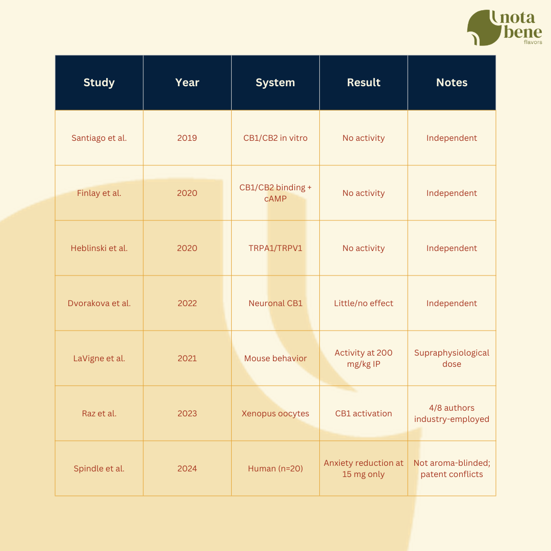 Santiago et al. (2019) tested six common cannabis terpenes at CB1 and CB2 receptors using radioligand binding assays. No activity detected. Finlay et al. (2020) repeated the test using both binding and functional assays (cAMP pathway). No activity. Heblinski et al. (2020) expanded the receptor panel to include TRPA1 and TRPV1, two ion channels often cited as alternative terpene targets. No activity at concentrations up to 100 μM. Dvorakova et al. (2022) tested terpenes at neuronal CB1 receptors. Little to no effect.
