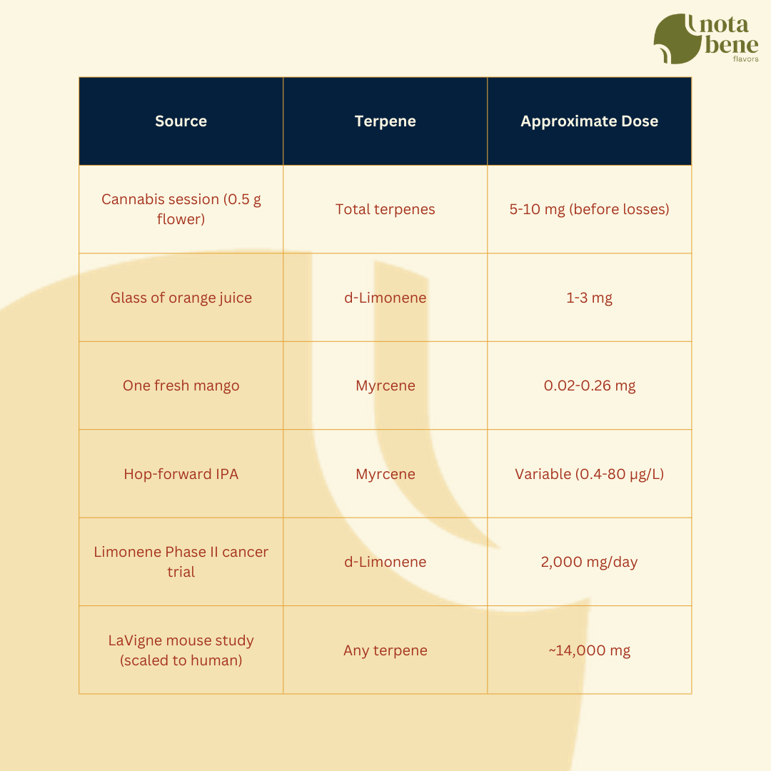 Cannabis flower contains 1-3% total terpenes by dry weight. In a typical smoking or vaping session with 0.5 g of flower, you are exposed to roughly 5-10 mg of total terpenes before accounting for combustion losses, incomplete vaporization, and first-pass metabolism.